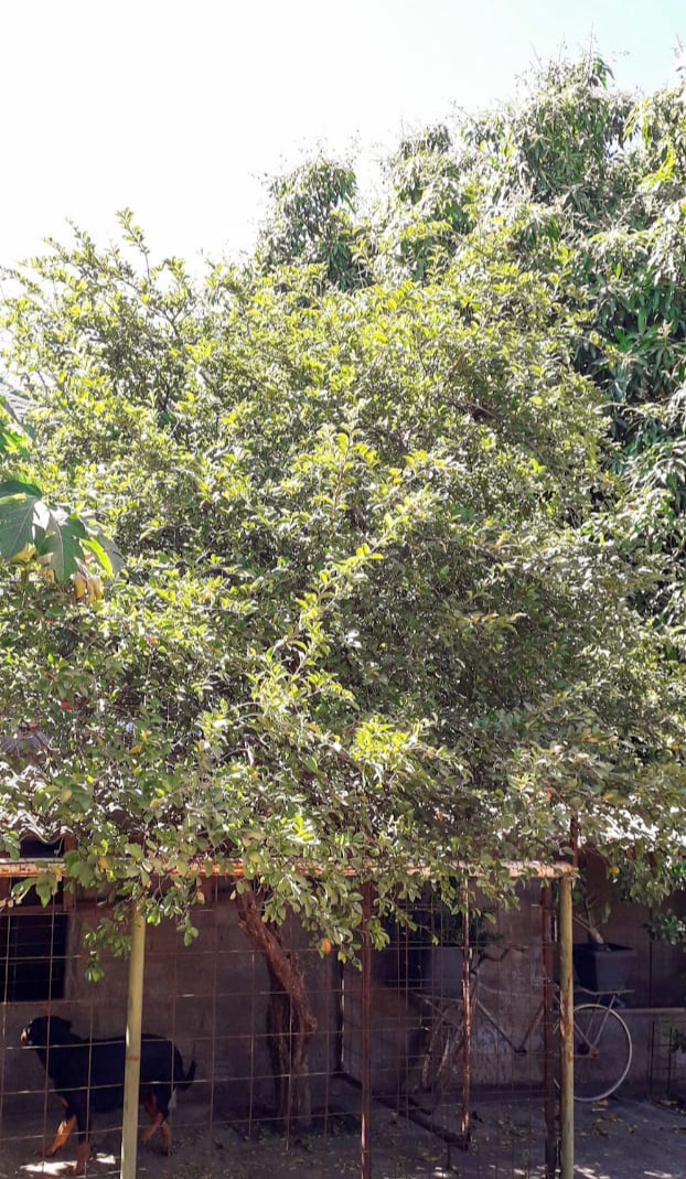 Temos as frutíferas também como a acerola, que produz uma sombra agradável, de médio porte e produz bastante frutos, temos 04 pés em casa.