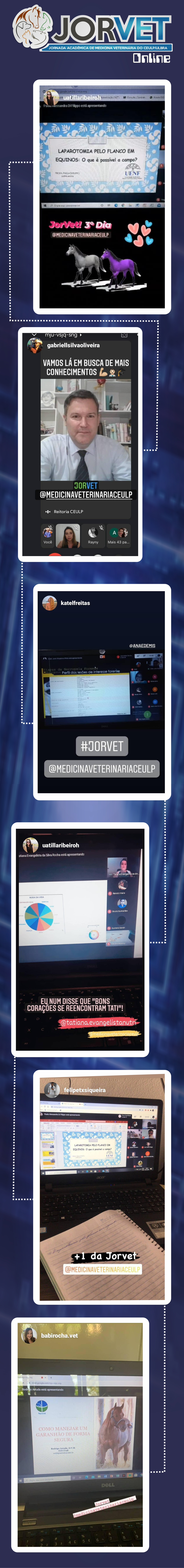 Com uma programação diversificada, o curso de Medicina Veterinária do Ceulp proporcionou aos acadêmicos entre os dias 6 e 8 de outubro, a JORVET. A atividade que ocorreu pela primeira vez online contou com a participação de convidados de várias regiões, que ministraram palestras sobre a Medicina Veterinária Legal, planejamento de vida para acadêmicos da área, métodos de contenção e condução do garanhão, entre vários outros assuntos.