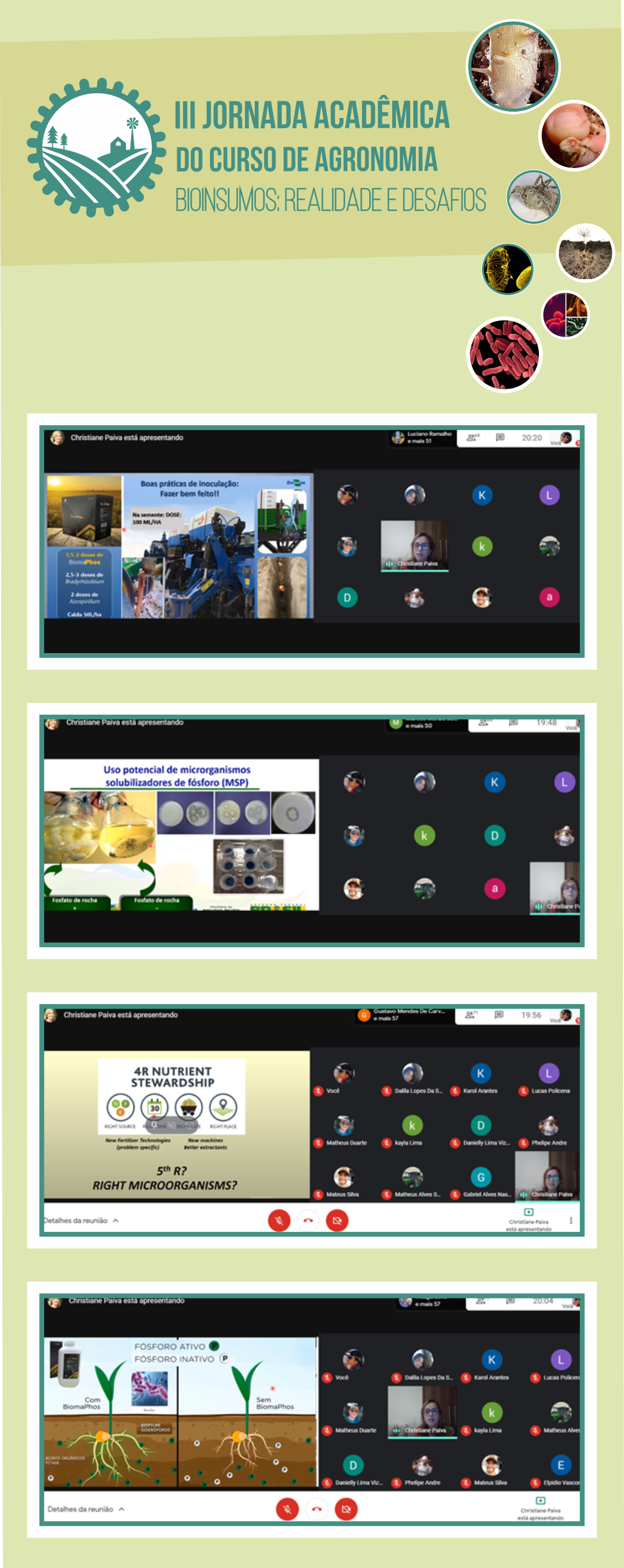 Com a temática Bioinsumos: realidade e desafios o curso de Agronomia realizou a terceira edição da Jornada Acadêmica nos dias 03, 04 e 05 de novembro de 2020. O evento foi totalmente gratuito e online com uma diversidade de palestras ministradas por convidados sobre o manejo biológico on farm: sustentabilidade com rentabilidade; Bioinsumos e a produção sustentável de alimentos; Manejo integrado da abdução fosfatada com o uso de produtos biológicos para fósforo.