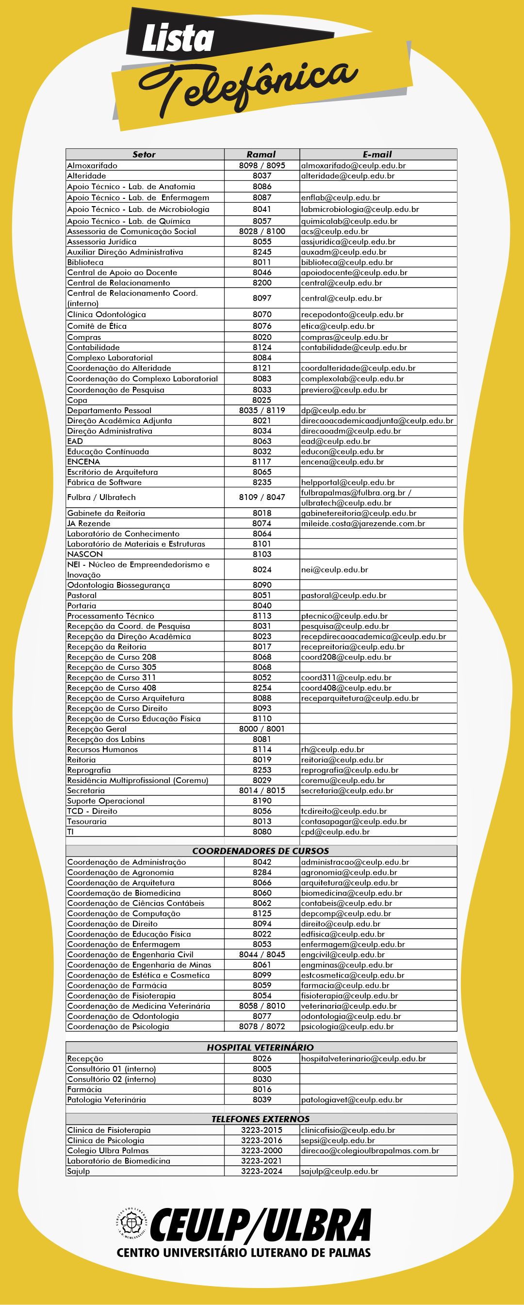 Sob a coordenação da Fabiane Jung Martins Müller, os setores Ulbratech e Fulbra agora ocupam a sala da antiga CEAC, no hall do Ceulp. Em funcionamento de segunda a sexta-feira, das 8 às 12h e das 14h às 17h30, o setor conta também com o auxílio do colaborador Danny Presley. O telefone para contato é 3219-8047 e os e-mails ulbratech@ceulp.edu.br e fulbrapalmas@fulbra.org.br.