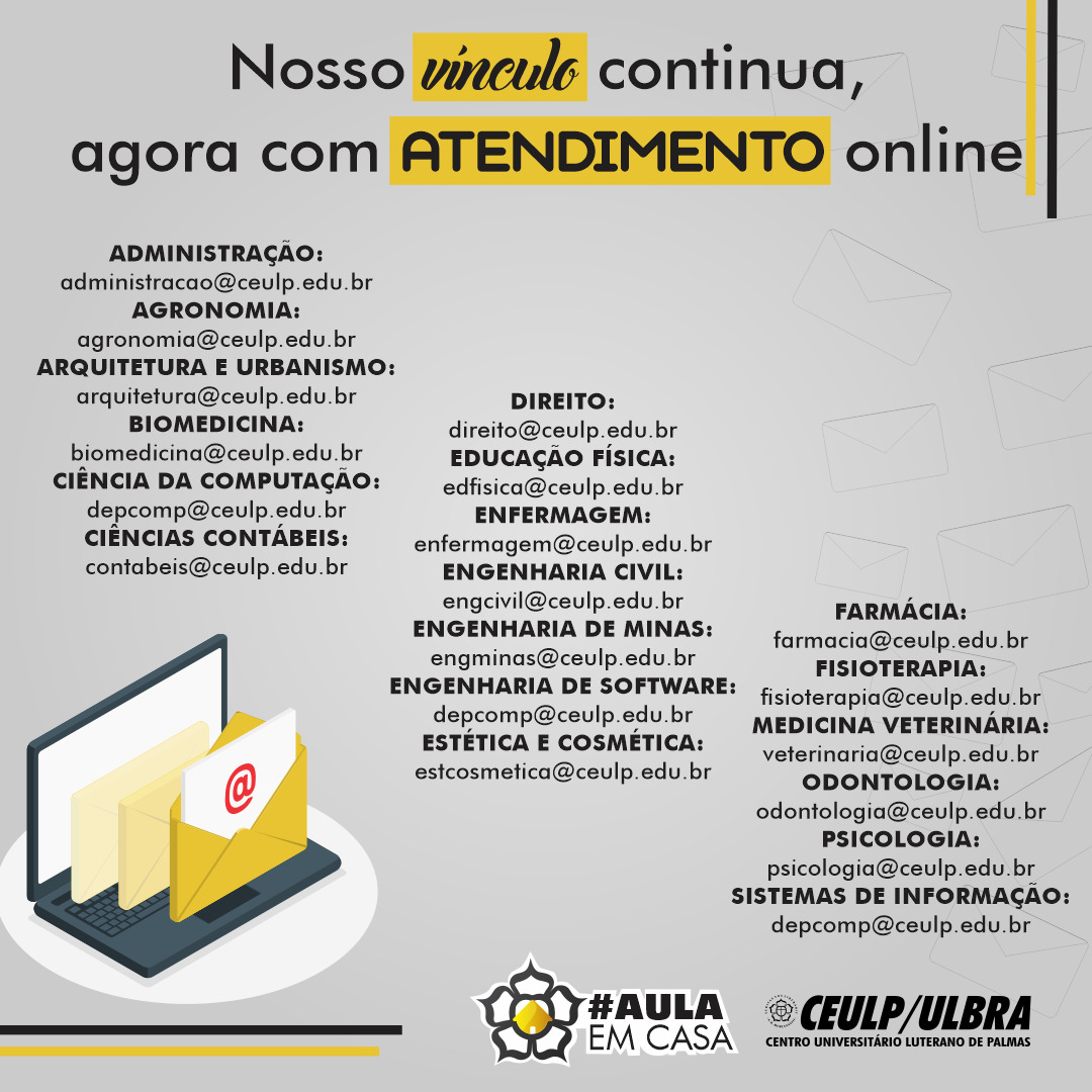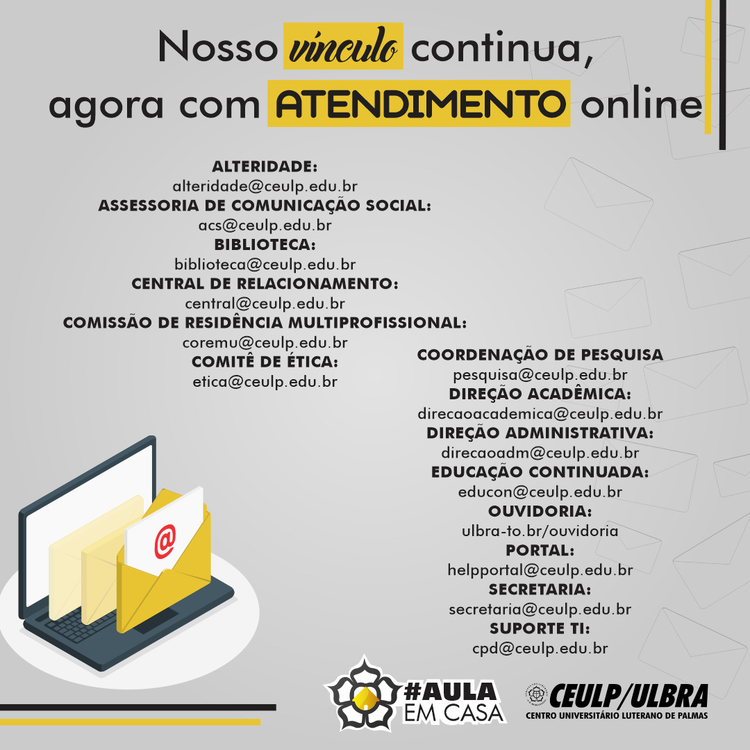 Portanto, reforçamos que os atendimentos presenciais no Ceulp/Ulbra continuam suspensos, enquanto persistirem as medidas protetivas ao Coronavírus. Porém, seguimos com atendimento através dos e-mails institucionais.
