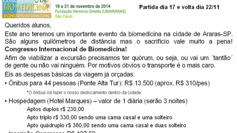 Caso queira conhecer a programação, que é fantástica, acesse o site do congresso em http://www.xivcbbiomedicina.com.br . São alguns quilômetros de distância mas o sacrifício vale muito a pena. A partida será no dia 17, em Palmas, e o retorno no dia 22 de novembro.