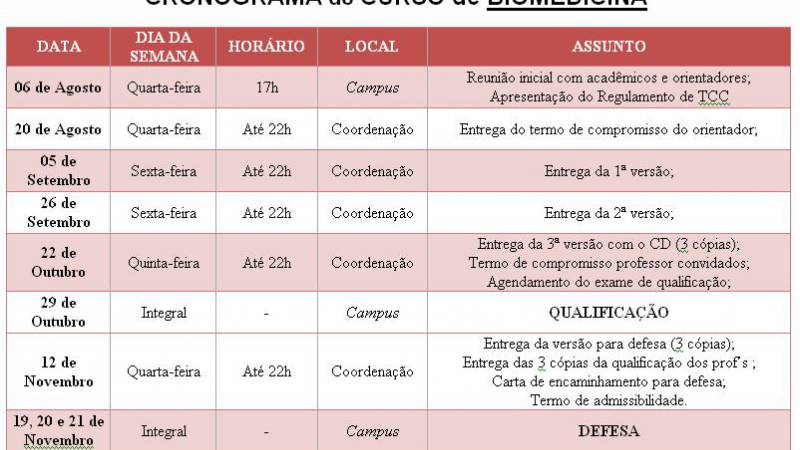 Em função da antecipação da Expro o calendário de TCC do curso de Biomedicina foi readequado e a entrega da terceira versão para qualificação foi adiada em uma semana.