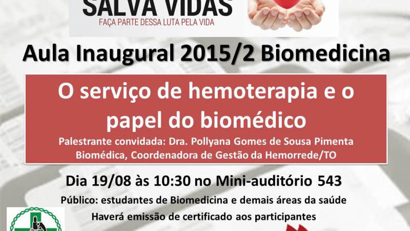 Este semestre teremos como palestrante convidada a Dra. Pollyana Gomes de Sousa Pimenta, Coordenadora de Gestão da Hemorrede/TO que irá apresentar sobre a atuação do biomédico na gestão de processos Hemoterápicos e as áreas de atuação do profissional hemoterapeuta.
