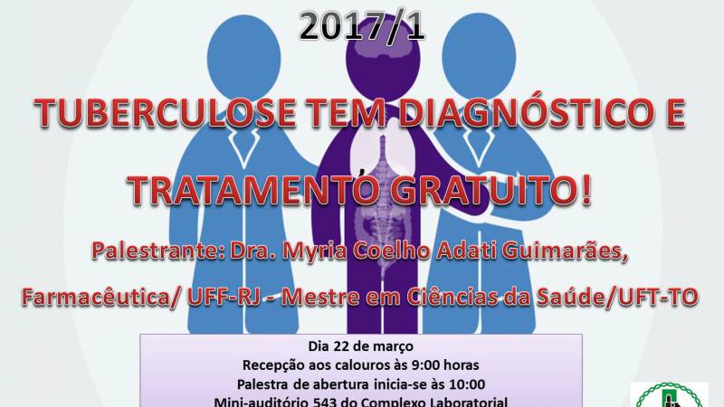 Este semestre teremos como palestrante convidada a Dra. MYRIA COELHO ADATI GUIMARÃES, FARMACÊUTICA/ UFF-RJ - Mestre em Ciências da Saúde/UFT-TO que irá apresentar sobre a Tuberculose, uma importante doença que preocupa muito os serviços de saúde até hoje. O tema será: TUBERCULOSE TEM DIAGNÓSTICO E TRATAMENTO GRATUITO!