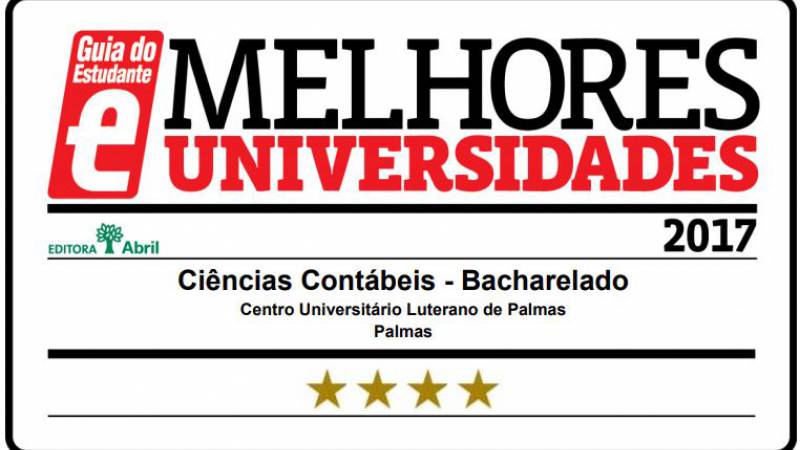 O curso de Ciências Contábeis do Centro Universitário Luterano de Palmas (Ceulp/Ulbra) recebeu o selo de 4 estrelas na avaliação realizada pelo periódico Guia do Estudante, cuja publicação acontecerá em outubro no GE Profissões Vestibular 2018. A coordenação do curso parabeniza a todos os envolvidos no processo de ensino/aprendizagem e atribui o estrelado da quarta estrela pelo quarto ano consecutivo ao trabalho desenvolvido juntamente com a direção, professores, colaboradores e alunos.