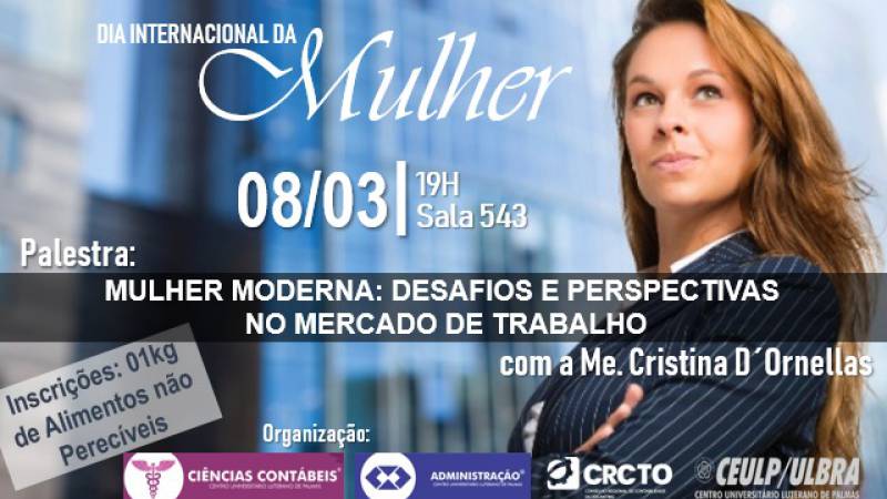 Foi realizado no dia 08/03, no CEULP/ULBRA, Evento Comemorativo em homenagem ao Dia da Mulher. A solenidade foi organizada pelas coordenações dos cursos de Ciências Contábeis e Administração e contou com o apoio do Conselho Regional de Contabilidade. Na ocasião foi ministrada pela Mestre Cristina D´Ornellas, a Palestra: MULHER MODERNA: DESAFIOS E PERSPECTIVAS NO MERCADO DE TRABALHO, onde foram discutidos os avanços e percalços da mulher na busca de reconhecimento no mercado de trabalho. O evento contou ainda com apresentações musicais, sorteio de brindes, homenagens a Mulheres que se destacaram no exercício da profissão contábil e da administração, e teve como foco primordial a conscientização da importância da mulher, e do respeito às suas especifidades.
