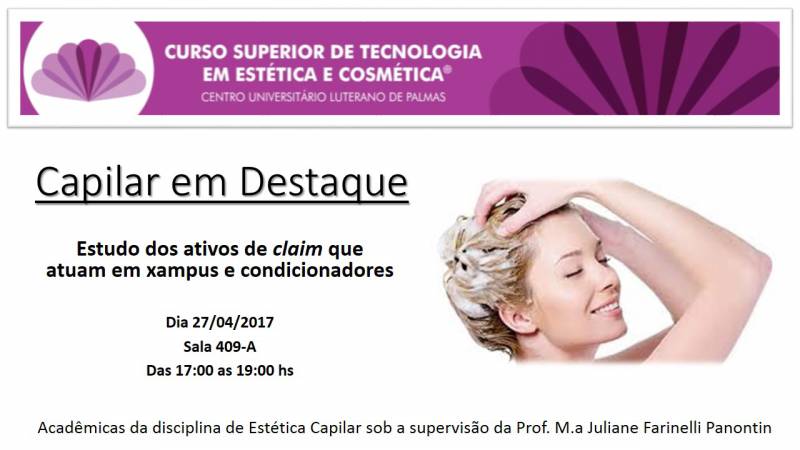 As acadêmicas da disciplina de Estética Capilar, sob supervisão da Prof. M.a Juliane Farinelli Panontin, realizarão um ciclo de seminários com o tema: Estudo dos ativos claim que atuam em xampus e condicionadores. Todos estão convidados a participar do evento que será realizado no dia 27 de abril, na sala 409-a das 17:00 às 19:00 hs. Os participantes receberão certificado de 2 horas e o evento é gratuito.