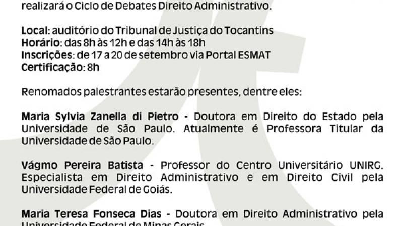 fonte: http://wwa.tjto.jus.br/esmat/index.php?option=com_content&view=article&id=1129:inscricoes-abertas-para-o-ciclo-de-debates-direito-administrativo&catid=38:noticias&Itemid=68