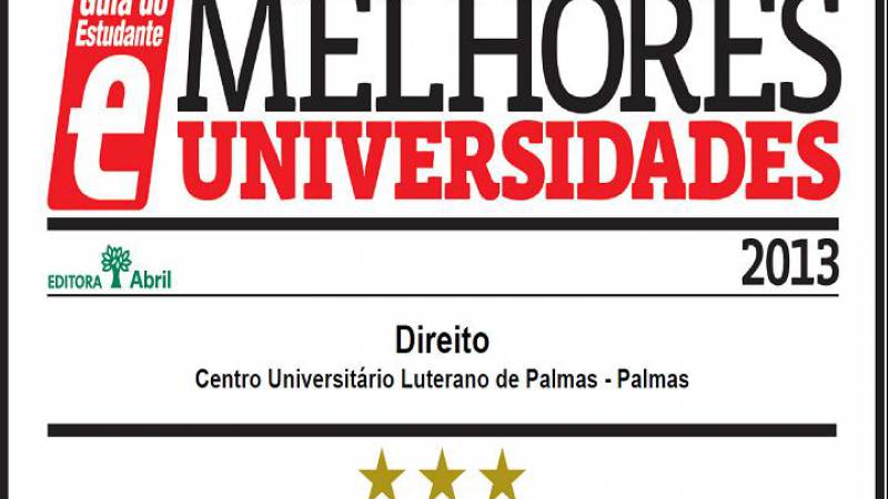 Temos o prazer de comunicá-lo(a) que o curso de Direito da(o) Centro Universitário Luterano de Palmas - Palmas foi estrelado na avaliação de cursos superiores realizada pelo Guia do Estudante (GE) e constará da publicação GE Profissões Vestibular 2014, que passa a circular nas bancas a partir do dia 11 de outubro de 2013.