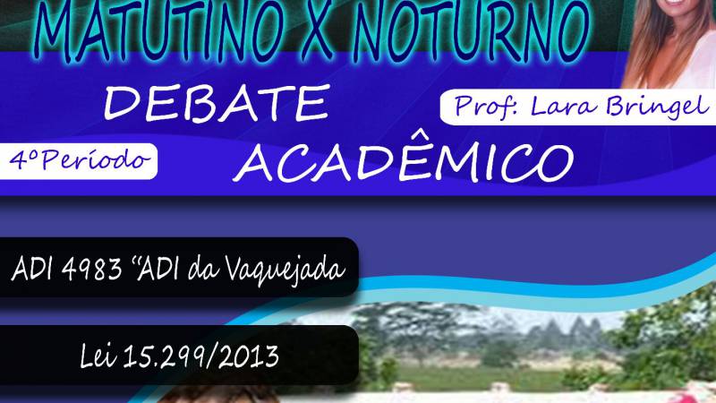 Ocorrerá no dia de hoje, 21.03.16, debate acadêmico entre as turmas de Direito Constitucional III, sobre a Lei nº 15.299/2013 e a ADI 4983 "ADI DA VAQUEJADA". Atividade coordenada pela Profª. MSc. Lara Lívia Bringel. Local: Miniauditório 563 - Tribunal de Júri. Horário: 19 h Serão emitidos certificados para fins de atividades complementares - 03 horas.