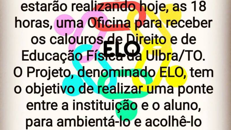 Ingressantes, atenção! Curso de Direito convida para oficina de recepção pelo Projeto ELO!!! Aguardamos tod@s vocês!!!
