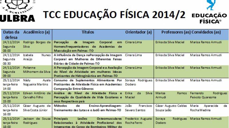 O curso de Educação Física Bacharelado deixa público os horários de banca de Trabalho de Conclusão de Curso. A participação é aberta a acadêmicos de todos os cursos e comunidade em geral. Haverá emissão de certificados para os alunos que assistirem as apresentações!
