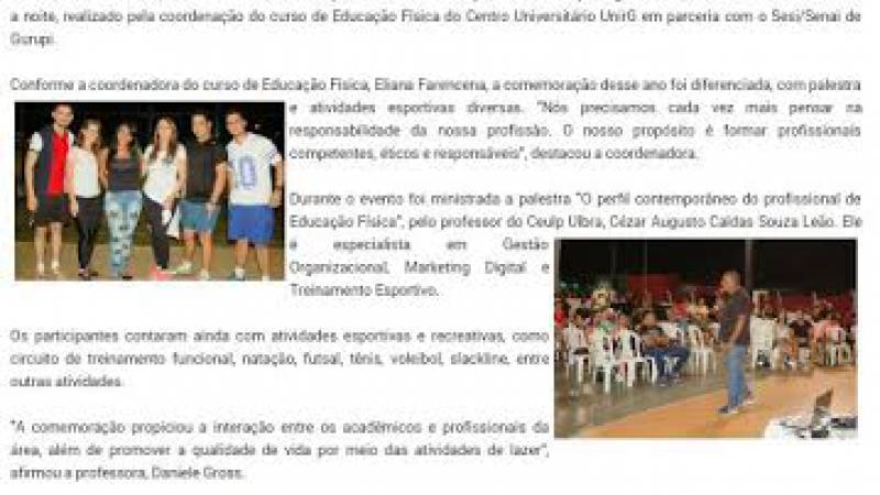 No dia 01 de setembro do corrente ano, foi comemorado o Dia do Profissional de Educação Física. No Centro Universitário Unirg foi realizado evento para prestigiar esse dia, onde o professor Cezar Caldas Souza Leão, ministrou palestra de abertura com o tem "O perfil contemporâneo do profissional de Educação Física".