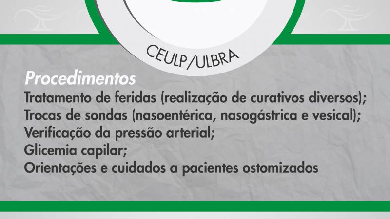 A Clínica de Enfermagem do CEULP/ULBRA está funcionando de terça a sexta-feira, das 14 às 18h. Os serviços oferecidos são: tratamento de feridas; trocas de sondas; verificação de pressão arterial; glicemia capilar; orientações e cuidados a pacientes ostomizados. O atendimento prestado na Clínica é gratuito a toda comunidade. Para maiores informações, acessar o cartaz em anexo.