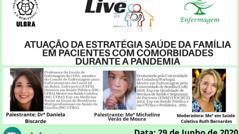 No dia 29/06/2020, às 19:30h, o curso de Enfermagem do Ceulp tem a satisfação de trazer uma live imperdível com o tema "ATUAÇÃO DA ESTRATÉGIA SAÚDE DA FAMÍLIA EM PACIENTES COM COMORBIDADES DURANTE A PANDEMIA".A live será transmitida através do Google meet; em breve será divulgado nas redes sociais o link para inscrição e participação.O evento é totalmente gratuito e será certificado.Participe e venha aprender mais!