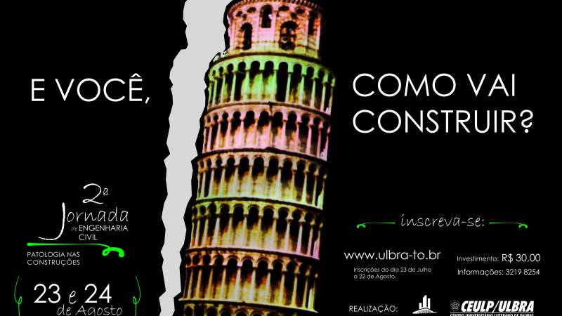 Desta forma, o curso de Engenharia Civil do CEULP/ULBRA vem convidar a comunidade acadêmica a discutir os aspectos relevantes sobre esta temática na nossa 2ª Jornada de Engenharia Civil, onde irão ser abordados assuntos referentes às novas tecnologias e a importância do profissional de engenharia planejar e executar estruturas duráveis.