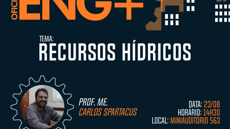 Está definido o calendário de Oficinas ENG+ para o semestre 2019/2. A oficina inaugural será realizada nesta sexta-feira, dia 23 de agosto, com o tema RECURSOS HÍDRICOS, e será ministrada pelo Prof. Me. Carlos Spartacus de Oliveira.