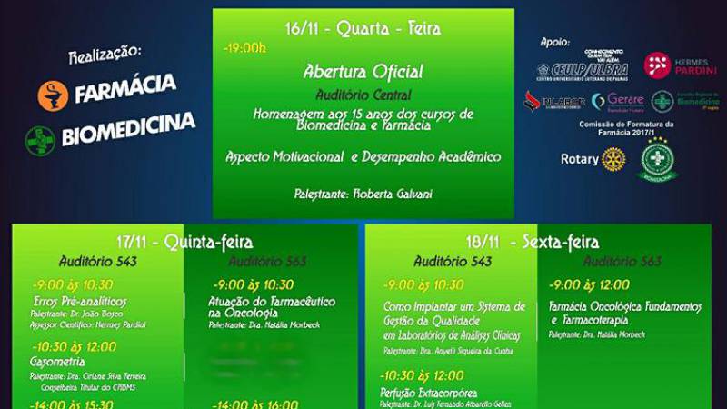 Com o objetivo de proporcionar aos acadêmicos dos cursos de Biomedicina, Farmácia e profissionais da área da saúde novos conhecimentos acerca de aspectos relacionados à saúde, será realizada entre os dias 16 e 18 de novembro, a V Jornada Acadêmica de Biomedicina e Farmácia do Centro Universitário Luterano de Palmas - CEULP/ULBRA.