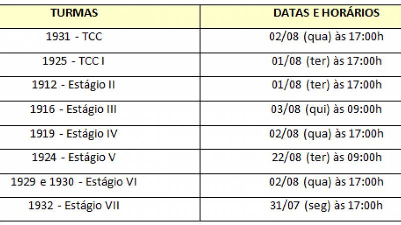 As aulas do semestre 2017.2 tem início na próxima segunda-feira (31/07) e para definir as atividades dos estágios supervisionados e Trabalho de Conclusão de Curso (TCC I e TCC), serão realizadas ao longo da semana, um encontro com cada turma de estágio para definição dos locais de estágio, entrega de documentos, assinatura dos termos de compromisso, entre outras informações imprescindíveis para a realização do estágio.