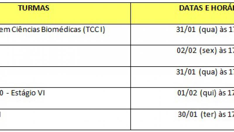 As aulas do semestre 2018.1 iniciaram nessa segunda-feira (29/01) e para definir as atividades dos estágios supervisionados e Trabalho de Conclusão de Curso (TCC I e TCC), serão realizadas ao longo da semana, um encontro com cada turma para definição dos locais de estágio, entrega de documentos, assinatura dos termos de compromisso, entre outras informações imprescindíveis para a realização das atividades.