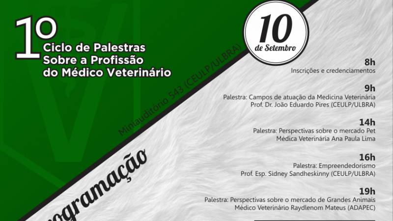 O I ciclo de palestras sobre a profissão do médico veterinário ocorrerá dia 10 de setembro a partir das 8h e será em homenagem ao dia do médico veterinário que é celebrado um dia antes, dia 9 de setembro. O evento acontecerá no mini-auditório do complexo laboratorial, nas instalações do próprio CEULP/ULBRA e contará com as palestras: Campos de atuação da Medicina Veterinária, Perspectivas sobre o Mercado Pet, Empreendedorismo e Perspectivas sobre o Mercado de Grandes Animais.