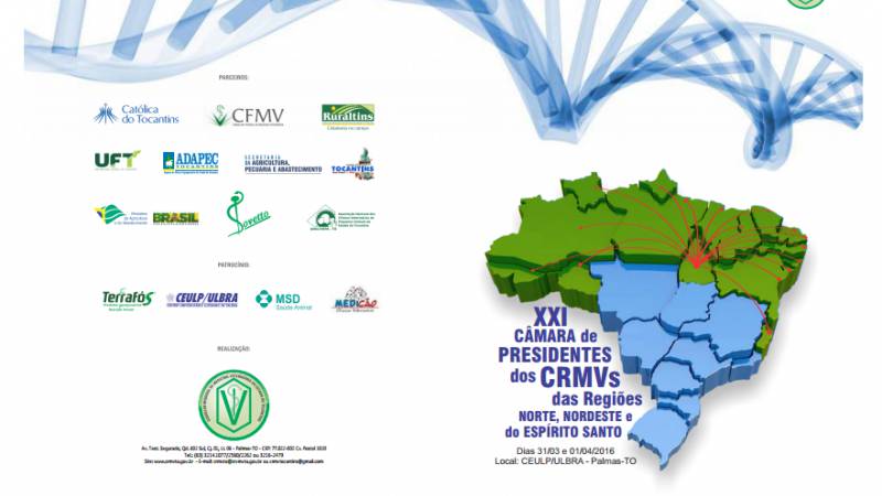 O CONSELHO REGIONAL DE MEDICINA VETERINÁRIA DO ESTADO DO TOCANTINS - CRMV-TO, em parceria com o Centro Universitário Luterano de Palmas-CEULP/ULBRA, sediará a XXI CÂMARA DE PRESIDENTES DOS CRMVs DAS REGIÕES NORTE, NORDESTE E DO ESPÍRITO SANTO nos dia 31/03 e 01/04/2016 (Sala de Reuniões do CEULP/ULBRA), evento que contará com a presença do Presidente do CONSELHO FEDERAL DE MEDICINA VETERINÁRIA - CFMV, Méd. Vet. Benedito Fortes de Arruda, bem como dos Presidentes do CRMVs das regiões Norte, Nordeste e do Espírito Santo. O objetivo do encontro é discutir estratégias para a melhoria da prestação de serviços médicos veterinários para a sociedade brasileira.