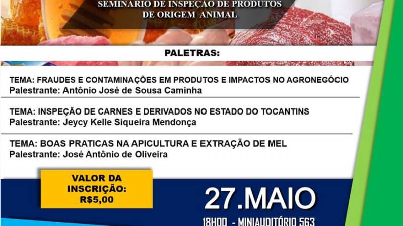 No dia 27 de maio de 2019 será realizado o Primeiro Seminário de Inspeção de Produtos de Origem Animal. Organização dos acadêmicos da disciplinas de de Higiene e Inspeção de Produtos de Origem Animal sob coordenação da Profa. Ma. Taísa Tavares dos Santos.