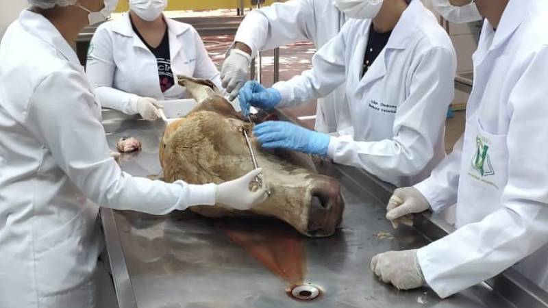 Aula prática de Cirurgia Veterinária II: Enucleação em bovino. A técnica consiste na retirada cirúrgica do globo ocular por causas traumáticas ou neoplasias, na maioria dos casos. Orientação Prof. Me. Guilherme Motta.
