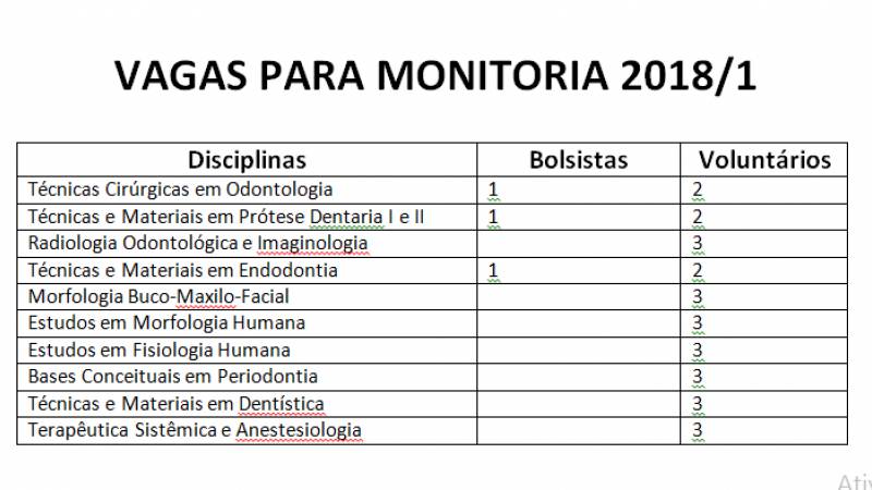 Está aberta as inscrições para o processo seletivo de monitoria 2018.1 do Curso de Odontologia, o prazo vai até o dia 09/02/2018, segue as disciplina e suas respectivas vagas. Para mais informações entrar em contato no 3219-8070.