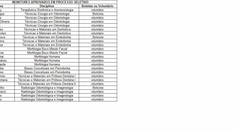 Segue a lista dos monitores aprovados do curso de odontologia para o semestre 2018.1.