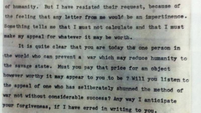 No dia 23 de julho de 1939, Mahatma Ghandi, o líder pacifista do processo de independência da Índia, mandou uma carta Hitler, presidente da Alemanha e que tinha acabado de comandar a invasão da Polônia. Na carta, o indiano pede ao alemão que evite a guerra, como conselho que alguém que tinha feito isso e teve sucesso. A carta foi interceptada pelo governo britânico e nunca chegou às mãos de Hitler.