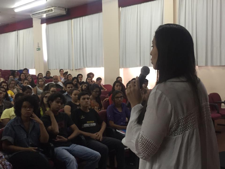 A professora Cristina, coordenadora adjunta do curso de Psicologia, explicou aos alunos sobre o Regulamento das Horas Complementares e sobre o aproveitamento de crédito externo e interno.
