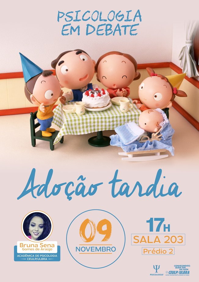 “Adoção tardia" será pauta de discussão no "Psicologia em Debate", que acontecerá no próximo dia 9 de novembro na sala 203, a partir das 17h. O tema será apresentado pela acadêmica de Psicologia Bruna Sena Gomes de Araújo com a orientação da Profa. Me. Cristina Filipakis. As discussões acerca da temática vem sendo desenvolvidas pela acadêmica em seu Trabalho de Conclusão de Curso.