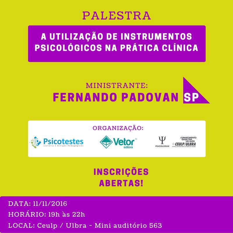 A Psicotestes organiza, em parceria com o curso de Psicologia do CEULP/ULBRA, a palestra "A utilização de Instrumentos Psicológicos na prática clínica", com Fernando Padovan, no dia 11 de novembro às 19h no miniauditório do CEULP.