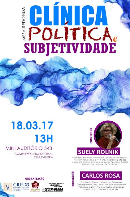 Neste contexto, o curso de Psicologia do CEULP/ULBRA, em parceria com o Conselho Regional de Psicologia – 23ª Região, promove no sábado, dia 18 de março de 2017 às 13h a mesa-redonda “Clínica, Política e Subjetividade” que será mediada pelo Prof. Dr. Carlos Rosa (Professor da UFT e do curso de Especialização de Psicologia Clínica do CEULP/ULBRA)