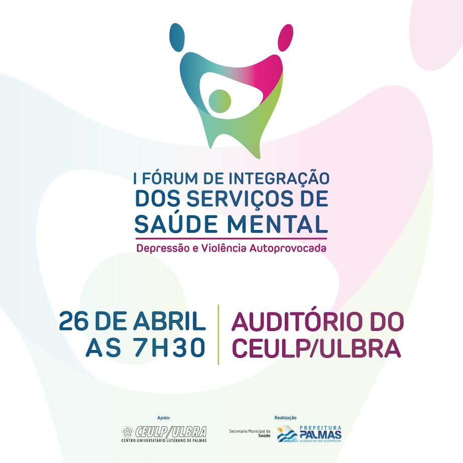 O curso de Psicologia do CEULP é parceiro com a Gerência de Saúde Mental, da Direção de Atenção Secundária em Saúde da Secretaria Municipal de Saúde de Palmas, na organização do I Fórum de Integração dos Serviços da Saúde Mental de Palmas - Tema: Depressão e Violência Auto Provocada, que acontecerá no dia 26 de abril de 2017, das 7h30 às 18h, no Auditório Central do Centro Universitário Luterano de Palmas -- CEULP/ULBRA - Palmas - TO.