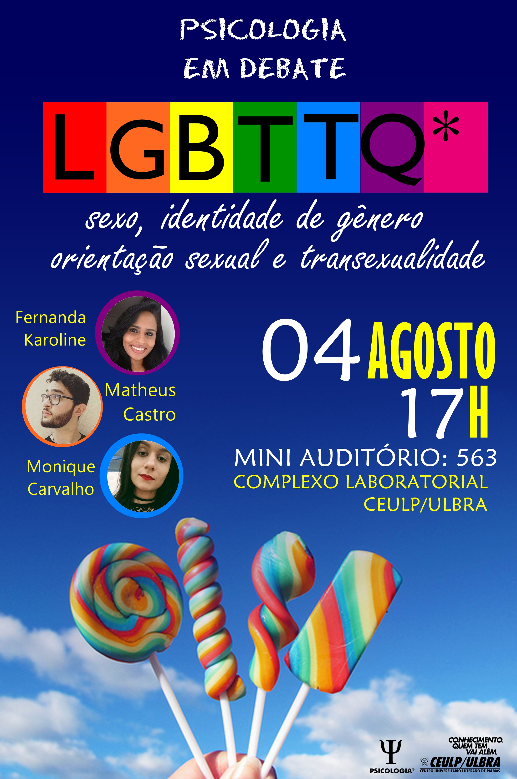 Na Ulbra, o curso de Psicologia promove o 1º Psicologia em Debate do semestre que será apresentado por acadêmicos de Psicologia que já estão inseridos em pesquisas sobre o tema. O evento ocorre nesta sexta, dia 4/08, às 17h, no miniauditório 543, sob o tema “LGBTTQ* – sexo, identidade de gênero, orientação sexual e transexualidade”. A professora Me. Lauriane Santos, da disciplina de Psicologia Comunitária, irá abrir a apresentação contextualizando o tema com as prerrogativas políticas e sociais do profissional de Psicologia.