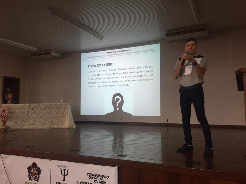 Este último tema foi apresentado por Ulisses Franklin Carvalho da Cunha, psicólogo em formação do CEULP/ULBRA, sob supervisão da Profª Me. Carolina Santin Cótica, com o título “Carrasco de mim mesmo: a ressignificação da vida após anos de autoabandono à luz da fenomenologia existencial”.