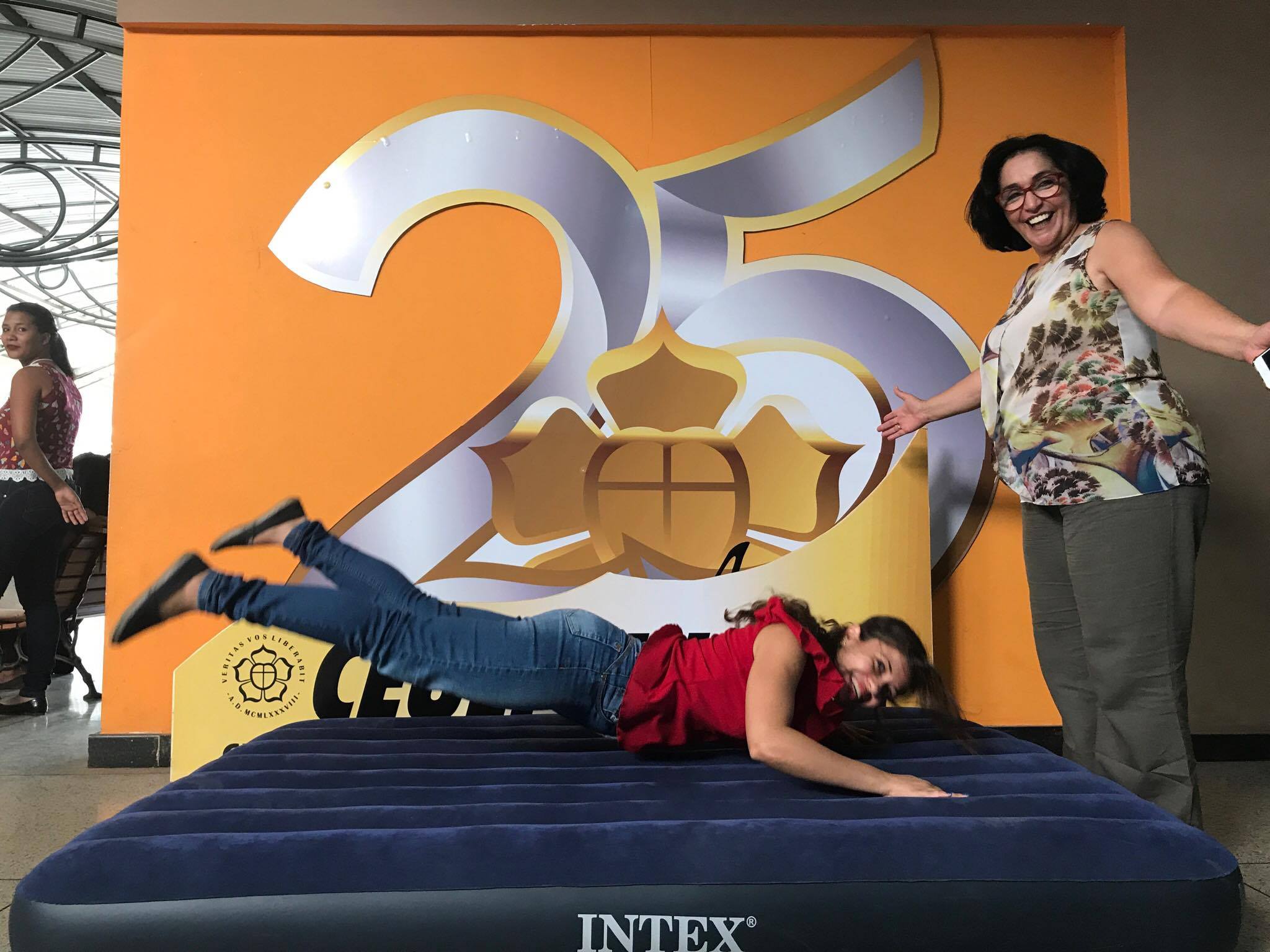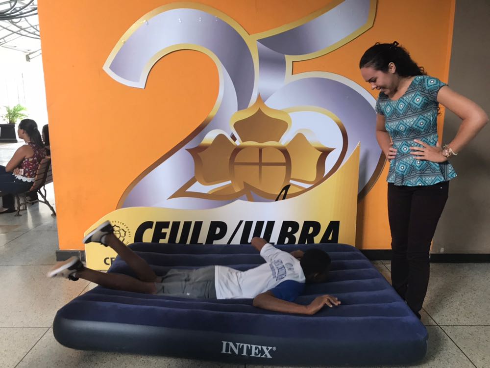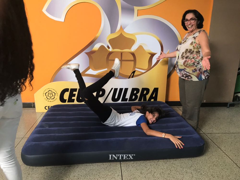 Os acadêmicos da disciplina de Intervenção em Grupos, orientados pela Profa. Me. Fabiana Curado, realizaram dinâmicas de grupo voltadas ao público visitante, em maioria estudantes do último ano do Ensino Médio. Em uma das atividades, os visitantes poderiam pular em um colchão que representava a sua entrada e escolha da profissão.