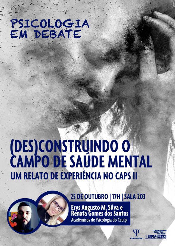 “(Des)construindo o campo de saúde mental: um relato de experiência no CAPS II" será pauta de discussão da 37ª edição do "Psicologia em Debate", que acontecerá no próximo dia 25 de outubro na sala 203, a partir das 17h. Com a orientação da Prof. Me. Lauriane Moreira, o tema será apresentado pelos acadêmicos de Psicologia do CEULP Erys Augsuto M. Silva e Reanata Gomes dos Santos.