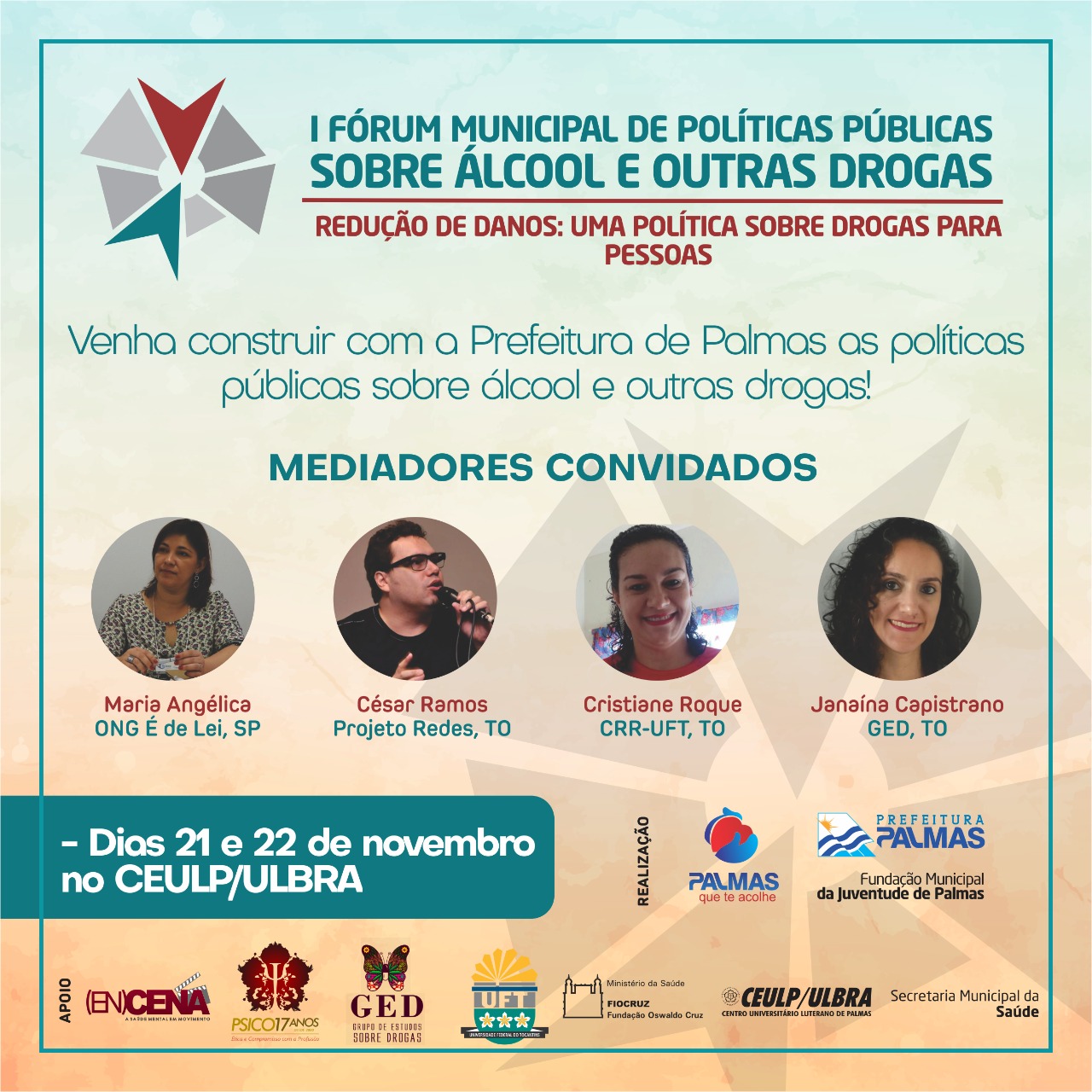 Acontece nos dias 21 e 22 de novembro o I Fórum Municipal de Políticas Públicas sobre Álcool e outras Drogas com o tema: "Redução de danos: uma política sobre drogas para pessoas. O evento acontecerá no Centro Universitário Luterano de Palmas e será aberto à comunidade com certificado de 20h. A inscrição será feita na abertura do evento, dia 21.