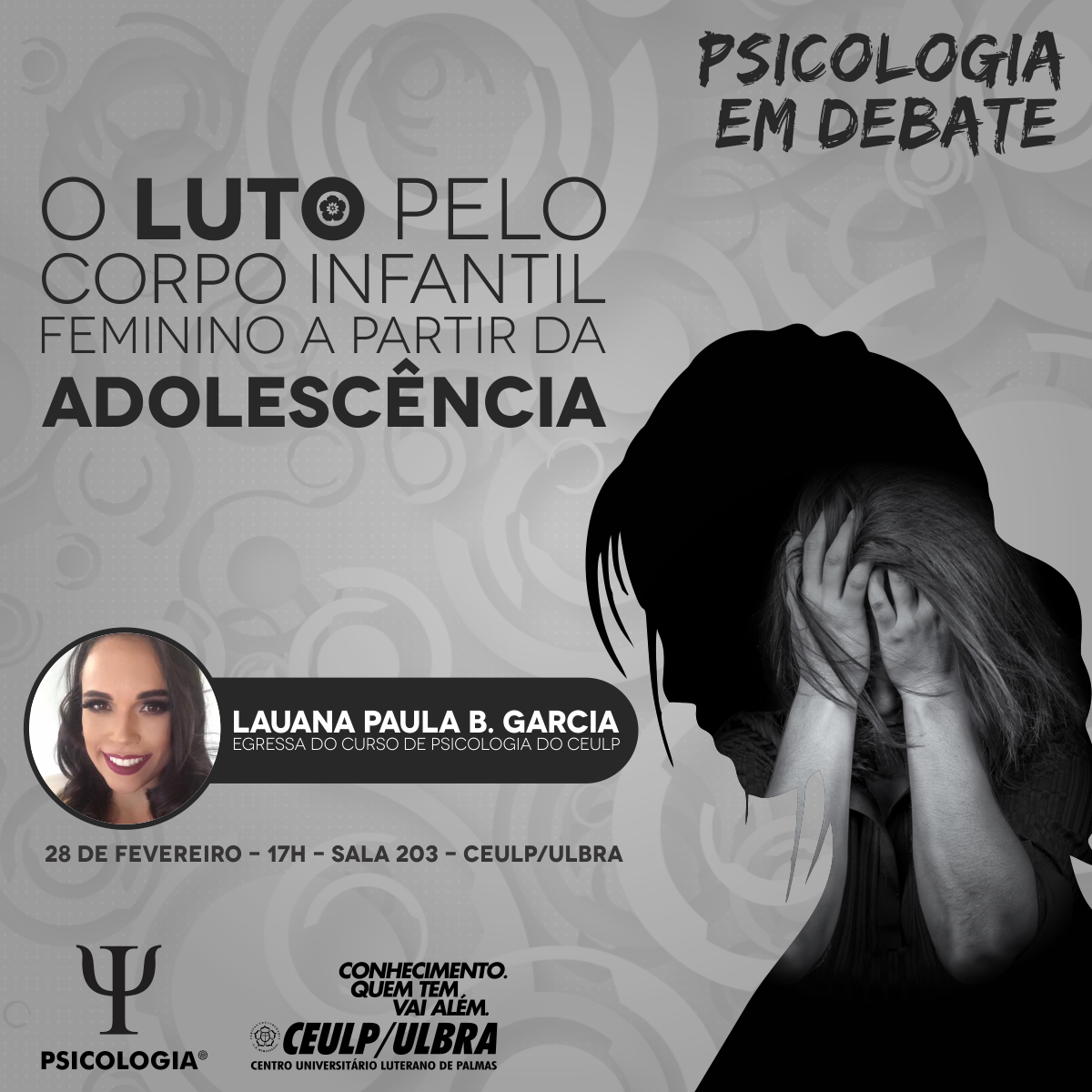 “O luto pelo corpo infantil feminino a partir da adolescência" será pauta de discussão da 42ª edição do "Psicologia em Debate", que acontecerá no próximo dia 28 de fevereiro na sala 203, a partir das 17h. O tema será apresentado pela egressa de Psicologia Lauana Paula B. Garcia, do CEULP/ULBRA. O tema foi desenvolvido pela Psicóloga em seu Trabalho de Conclusão de Curso, que teve a orientação da Profa. Dra Irenides Teixeira.