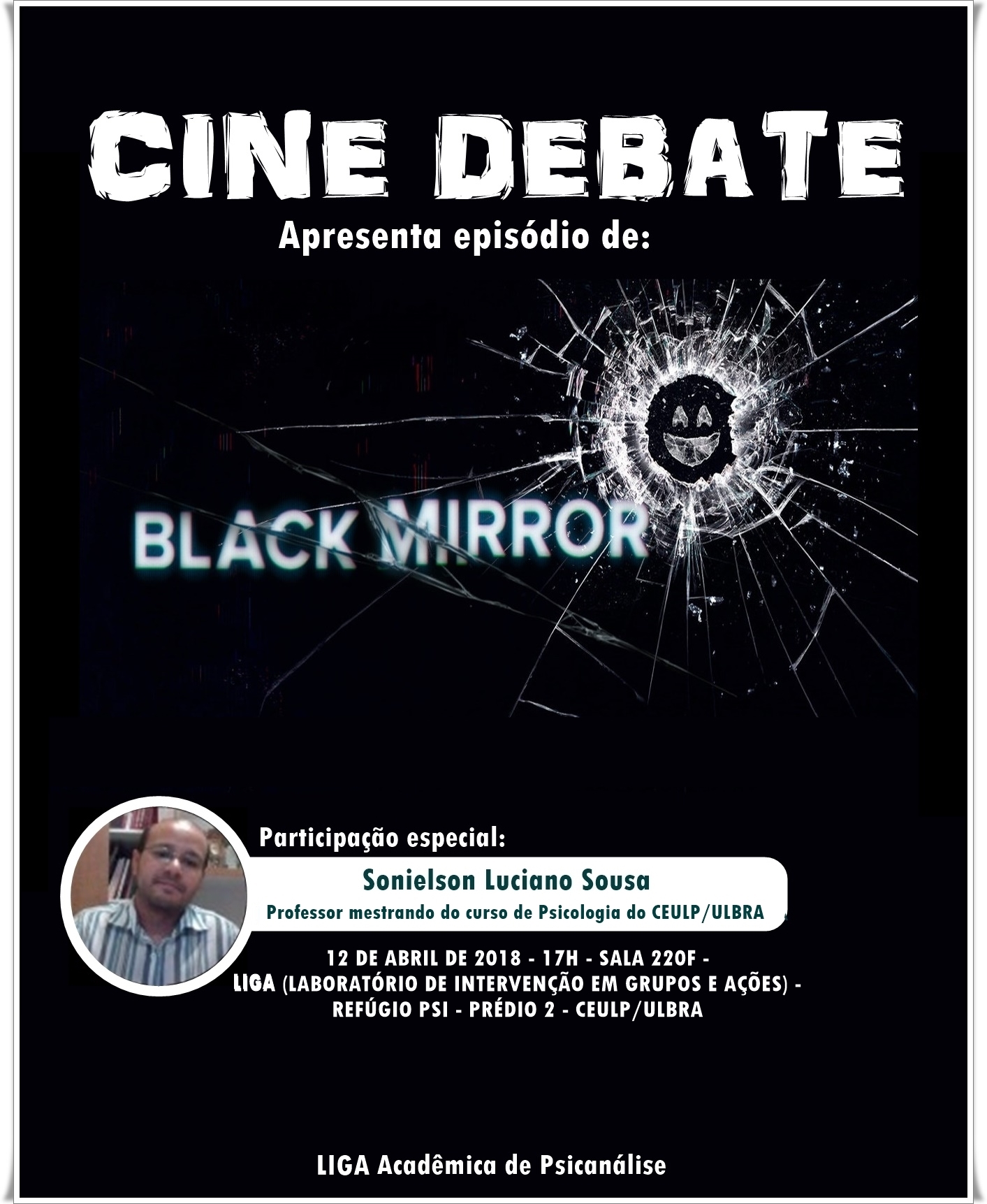Acontecerá hoje, dia 12 de abril de 2018, o primeiro CineDebate da LIGA Acadêmica de Psicanálise, do curso de Psicologia do CEULP/ULBRA. A LIGA apresentará um dos episódios da série Black Mirror, cujo não foi especificado no intuito de promover suspense e curiosidade ao público. E, posteriormente, abrirá um debate sobre o episódio fundamentando-se na abordagem teórica psicanalítica.