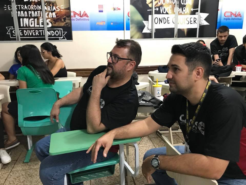 Profs Mestres Fabiano Fagundes e Iran Oliveira apresentam o game aos congressitas do CAOS.