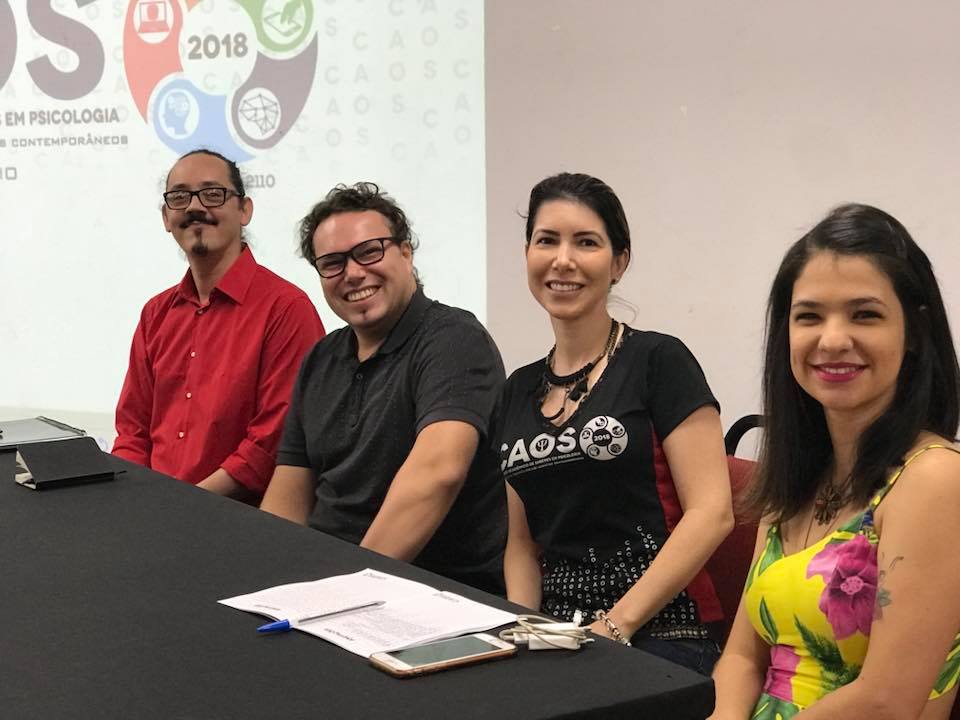 Os Psicólogos Jonatha Rospide Nunes, Cesar Gustavo Moraes Ramos, Carolina Cótica (mediadora) e Ana Carolina Peixoto. Foto: Irenides Teixeira