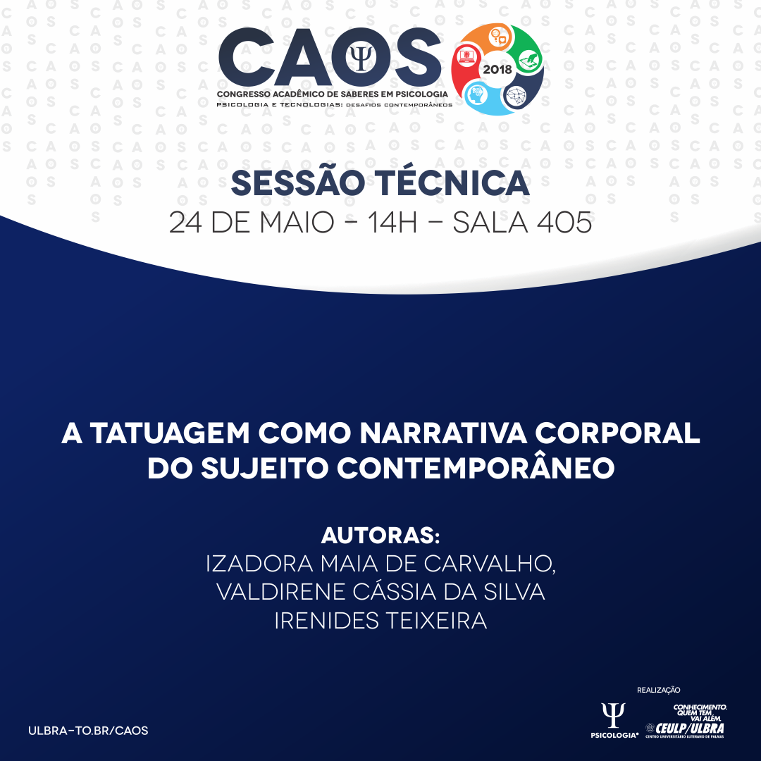 A egressa do curso de Psicologia, Izadora Maia de Carvalho, em parceria com as professoras Valdirene Cássia da Silva e Irenides Teixeira, submeteu sua pesquisa "A tatuagem como narrativa corporal do sujeito contemporâneo", que defendeu em seu Trabalho de Conclusão de Curso (TCC), ao CAOS 2018.