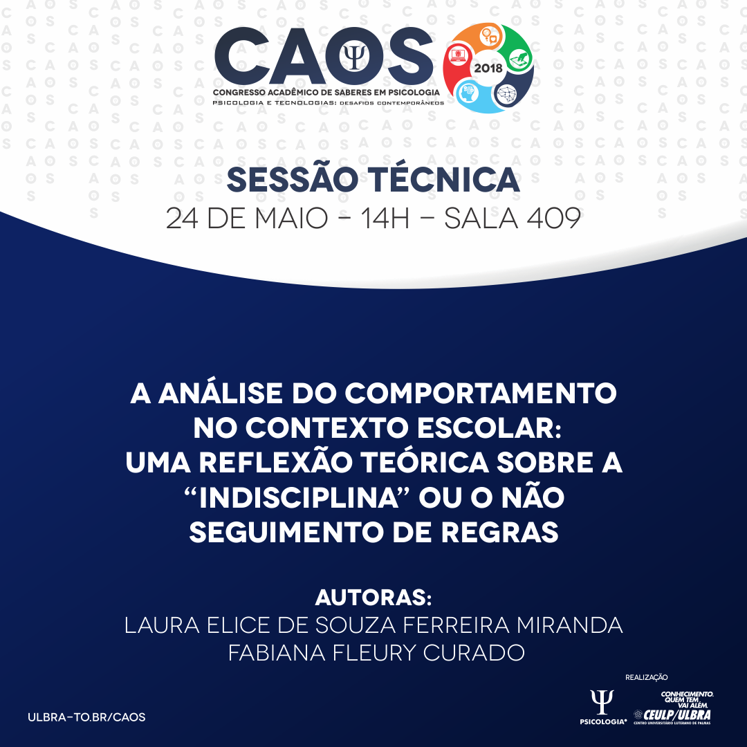 A acadêmica do curso de Psicologia Laura Elice de Souza F. Miranda, em parceria com a psicóloga Fabiana Fleury Curado, submeteu e apresentou o artigo “A Análise do Comportamento no Contexto Escolar: uma reflexão teórica sobre a “indisciplina” ou o não seguimento de regras”, durante as sessões técnicas do Caos 2018 ocorridas no dia 24/05.