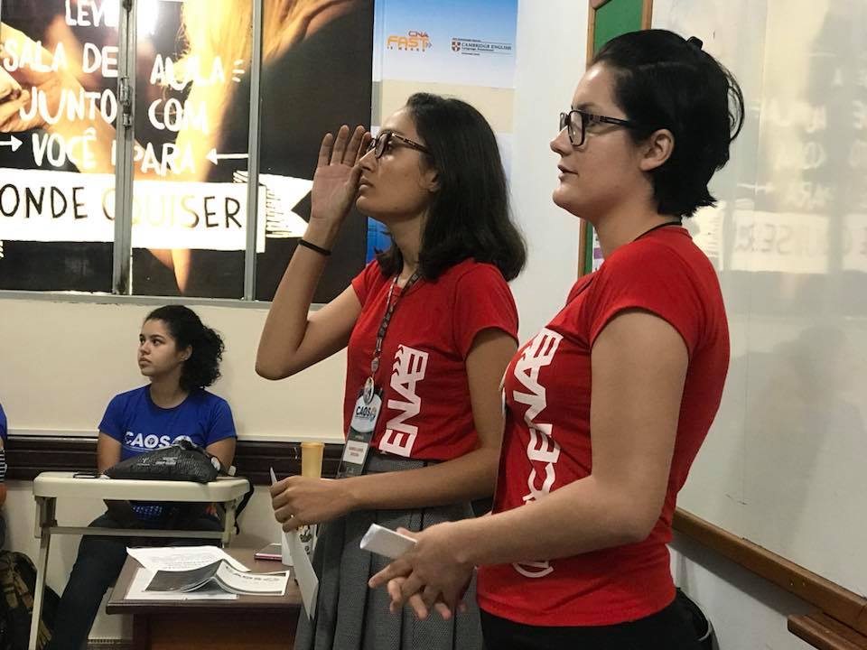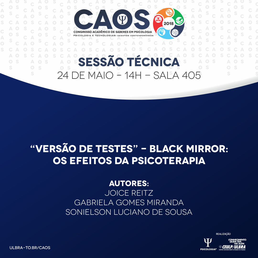 As acadêmicas do curso de Psicologia, Joice Reitz e Gabriela Gomes Miranda, em parceria com o professor Sonielson Luciano de Sousa, submeteram e apresentaram o artigo “versão de testes” - black mirror: os efeitos da psicoterapia", durante as sessões técnicas do Caos 2018 ocorridas no dia 24/05.