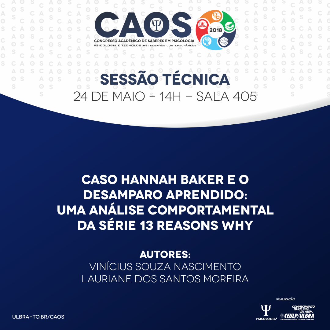 O acadêmico do curso de Psicologia, Vinícius Souza Nascimento, em parceria com a professora Lauriane dos Santos Moreira, submeteu e apresentou o artigo “CASO HANNAH BAKER E O DESAMPARO APRENDIDO: uma análise comportamental da série 13 Reasons Why", durante as sessões técnicas do Caos 2018 ocorridas no dia 24/05.